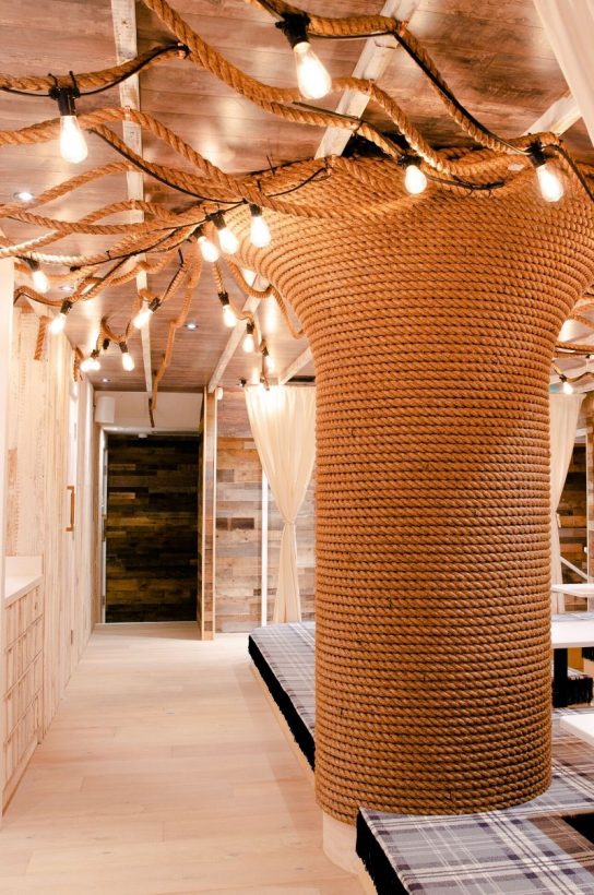 Set within a two-storey space, the modern design is inspired by a treehouse, lined with warm woods and cosy seating areas throughout, creating a warm and casual environment. Guests will find a ‘tree trunk’ at the centre of the ground floor, and diners will eat under a tree ‘canopy’ upstairs.