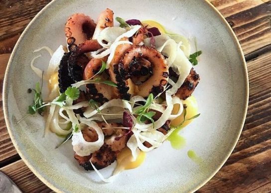 Roe served a mix of British sustainable seafood dishes using local produce, with Irish influences from head chef and owner Simon Whiteside’s heritage. Whiteside, previously of Hook in Camden, created dishes such as the signature cuttlefish & ink arancini with pecorino foam, squid noodles with fermented hot sauce and grilled baby octopus with miso emulsion (as pictured below).