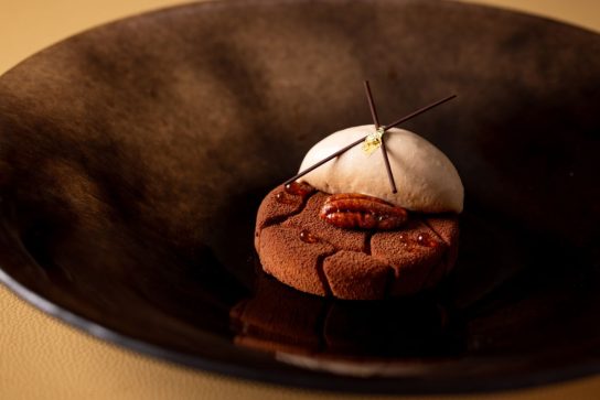 “I’m classically trained so I love classical French cuisine, but coming from Australia where there’s a lot of Asian influence – I’ve been around it my whole life – I’m able to blend some of the classics with some new ways of thinking and blending, very gently, very carefully, a little bit of Asian influence here and there, while obviously showcasing the amazing British produce that we have: the beef, the venison, the scallops, the monkfish, the turbot. We literally do have some of the best produce in the world. When it comes to what’s on the plate, for me it’s very important that it’s either a nod to a classic that’s reinvented or modernised or tweaked to our palate and our dining style now. Or sometimes I’ll play on people’s emotions a little bit, on old childhood memories that I think a lot of people may have experienced. For instance, on my pecan dessert we make this beautiful cocoa nib ice cream inspired by Coco Pops milk. I’m not here to make food complicated; I’m here to bring some amazing produce together with some flavours that really work. Nothing too leftfield, nothing too crazy.
