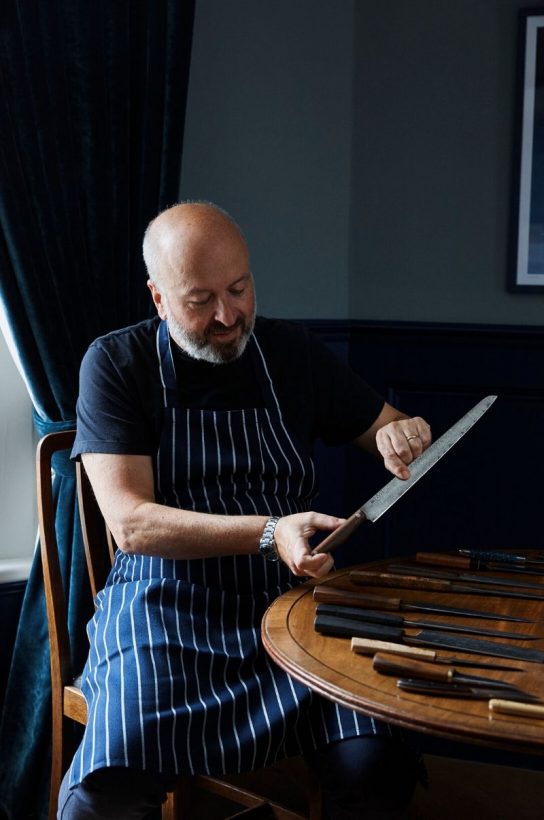 “These knives have all come about in the last 10 years – I did leave a couple of my favourites at home! It’s all about the steel – you can put a nice handle on a knife but it really is about someone taking the metal and using heat to make it as refined as possible so that you can put a very good edge on it and cut relatively effortlessly, but also allow the food to look better on your plate. It’s a bug bearer of mine when you see supermarket adverts for roast lamb or beef, you can see it has been cut with a knife that’s not sharp enough, whereas if you cut a slice of beef with that (points to his knife), it would look almost like a polished wall with texture to it. I like having the right knife for the right job.