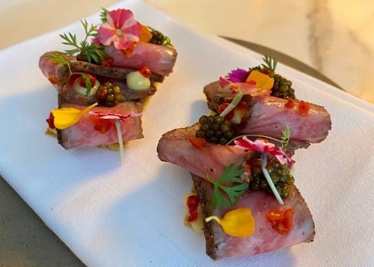 I think I’ve found myself a new regular. Dinings SW3 is a Japanese sushi and izayaka restaurant in a cobbled mews in Knightsbridge. The restaurant mixes a relaxed, neighbourhood buzz with chic, modern design. I came to visit the cocktail bar for their newly launched ‘Otsumami’ menu. My favourite drink was the ’88’ a take on a classic margarita with mezcal, yuzu, clementine and sake. You have to sample the bar snacks – the A5 wagyu beef crostini is as pretty as it is delicious.