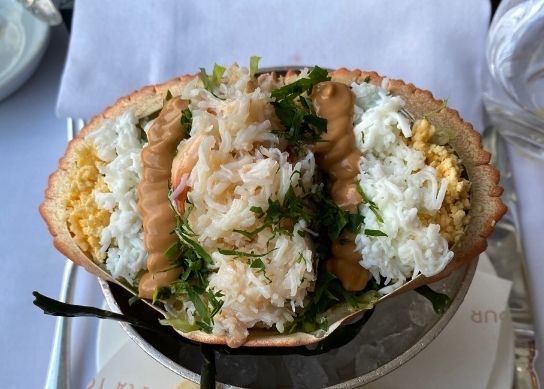 Britain loves a trifle. Rich layers of smooth custard, cream, fruit, jelly, booze, and a cakey element come together in a decadent, luscious harmony. The secret to an excellent trifle, you won’t be surprised to learn, is executing each of the layers to the highest possible standard. Here at a special meal on the Scott’s terrace, designed to celebrate the Queen’s Platinum Jubilee, the trifle executed and even raised those standards. ‘Twas a thing of beauty, topped with dehydrated raspberries for crunch, vanilla bean studded whipped cream and gold leaf (just because) the trifle was a beautiful and buoyant success. It’s on the menu until late June.
