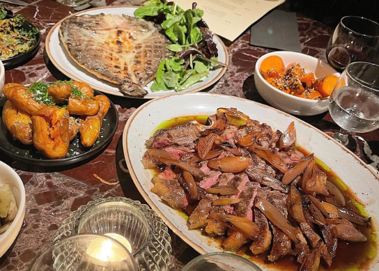 Husband and wife team Amy Corbin and Patrick Williams continue to take over their local area of Peckham with the newest addition to their mini empire, Kudu Grill. Housed in a former pub in the area of Nunhead, this space with it’s moody interiors, low Champagne-coloured lighting and dark wooden Venetian blinds (you could be in Minetta Tavern) is a local’s dream. Couples can perch at the counter and enjoy the Braai (a South African grill) with dishes such as grilled potato flatbread with lardo and wild garlic, grilled prawns with peri peri butter and a Braai whole black bream to stuff into zhug butter roti. Be sure to leave room for the Peppermint crisp chocolate – a play on a famous South African chocolate bar.