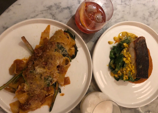 I’ve been wanting to visit Hām since the first lockdown. It has such allure. A warm and friendly neighbourhood restaurant with an imaginative menu, clever cooking using quality suppliers and a banging cocktail list. With a new head chef in the kitchens (Spyros Koufalakis, formerly of NOPI & Barrafina), our food was colourful and vibrant with Mediterranean twists throughout. We started with a wonderful nduja croquette with a creamy herby mayo followed by a gorgeous courgette dish, with labneh, preserved lemon and sourdough (Hām source their bread from Margot’s bakery, around the corner). We also shared beautiful plates of heritage beetroot and pan-fried Stone bass. For dessert we had white peach, custard and fig leaf oil – the perfect end to dinner at this gem of a restaurant.
