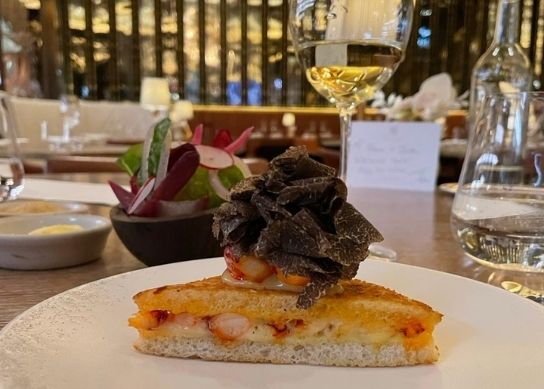 I am not supposed to be eating carbs at the moment because of my increasingly tubby nature. At The Dorchester’s grill room, manned by the nearly 29-year-old Tom Booton, I was able to resist beyond a nibble of brioche which arrived pre-2002 Bollinger, and I was pleased my remaining courses were relatively untouched by starch. That being said, I could not, and would not, ignore a lobster thermidor toastie, because by its very nature it falls into the ‘reason to be alive’ category. It was a soft and near-perfect snack: inside thinly sliced, buttery white bread were tender chunks of lobster, warm amongst a balanced thermidor sauce and dazzled by wisps of black truffle. To the side was a vinegary salad of leaves, pickled shallots and buttons of radish. In my glass was a Reisling. I loved it, and I loved it even more after Tom told me it started out as a staff meal.
