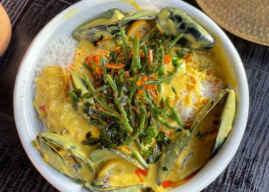 Have you ever come out of the appropriate exit at King’s Cross? No, you haven’t. It’s impossible. A dream of fools. Once you tap out, you’re in an inescapable nightmare, an optical illusion, with escalators leading nowhere except five different Leons, and oh, wait, now you’re trapped inside a Boots. You follow the signs of sunlight in the distance, accidentally running into a post-work staff party outside Google HQ. Chilling. But despite all this you keep going, because that’s how you get to Hoppers King’s Cross, and that’s where the mussel hodi is. The bright yellow dish is my favourite on the menu (it’s served only at the KX location), and beautiful: mussels in a coconut broth, provocatively open and placed on a bouncy bed of string hoppers, themselves flawlessly, virginally, white. Green samphire covers the top. It pairs so well with the cumquat gin and tonic on the new terrace cocktail menu – the ‘Sunset Squeeze’ – and with an ice-cold shot of lychee infused arrack. Worth it.