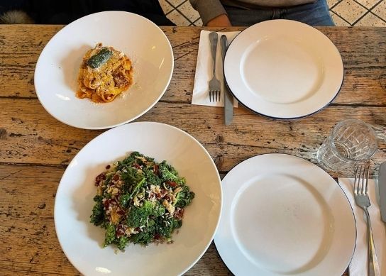 Manuka Kitchen on the Fulham Road (just round from the big Waitrose) invariably seems busy (especially for brunch at the weekends). At north of £50 for a light lunch for two it’s clearly geared towards a certain part of the Fulham crowd, but you can’t fault the food, and the team are lovely. The chicken salad and Bolognese (pictured) worked well as a half and half, and if you’re a fan of a certain brand of peanut butter cups then their peanut butter pretzel chocolate tart will be right up your street.