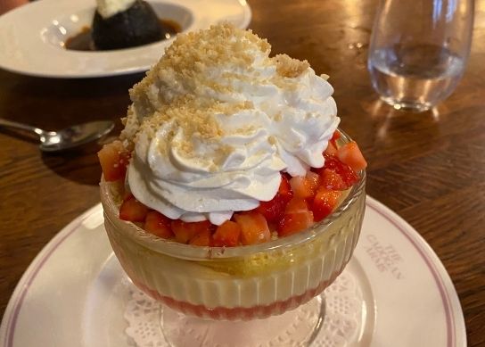 The Cadogan Arms is one of those places that has been on my list to visit ever since it reopened on the King’s Road in 2021. JKS’s ever-expanding polished restaurant brands continue to draw me in, and it was no different here. A caricature of a ‘posh pub,’ The Cadogan Arms somehow makes you feel like a long-standing regular. That’s nice. I visited to try their ‘Chelsea in Bloom’ menu, which launched alongside London’s largest free flower festival. I kicked things off with a classic prawn cocktail before moving onto a warming lamb suet pudding served with wild garlic, anchovies, and buttered Jersey royals. Pub classics, done well. The one thing you definitely shouldn’t leave without trying is the richly indulgent strawberry sherry trifle with almond crumble. I think it’s fair to say I was a trifle full after lunch.