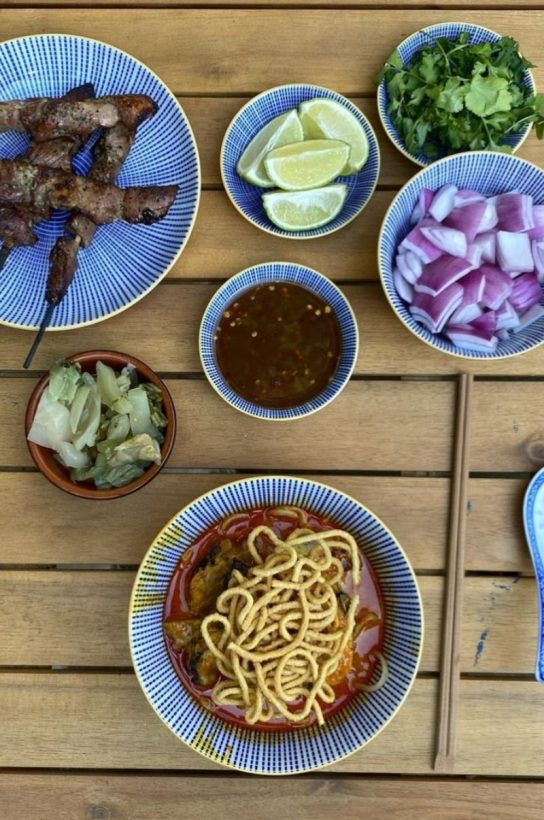 He killed it with a spicy t-bone collaboration with HG Walter, now John Chantarasak has got together with Restaurant Kits to bring a special Thai new year meal to our doorsteps. I’ve long been a fan and this did not disappoint – juicy pork skewers with a fiery tamarind and chilli dipping sauce and khao soi – a rich, hearty dish of noodles, coconut curry sauce, burnished chicken thighs and all the condiments. I loved frying the hand-pulled noodles to make a nest – with John’s playlist blaring in the background. Happy Songkran!